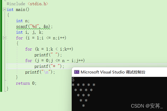 If it's like a pyramid , Except for the need to for Loop nesting controls the printing *, Also add an inner loop to specifically control spaces , This condition is generally for(k=1;k<=n-i;k++)