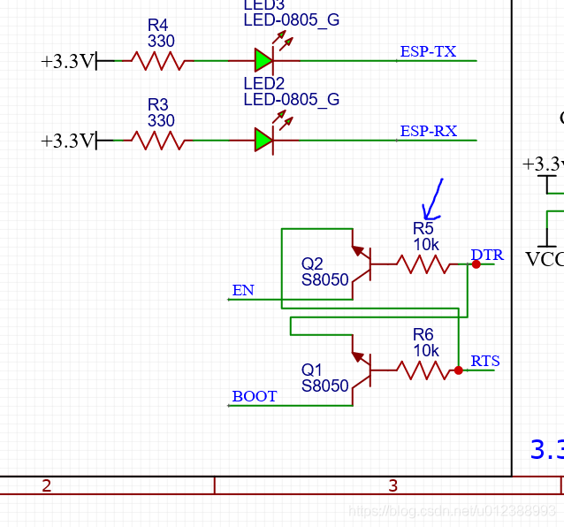 需要注意的是这里是自动复位/下载电路,它的电阻R5以及R6要接近10K,我一开始参数写成1K,焊接时候也焊了1K,结果就是直接失效了
