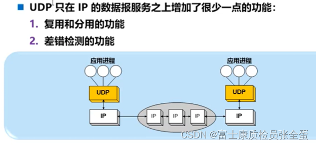 用户数据报协议(UDP)只在IP的数据报服务之上增加了很少一点功能,就是复用和分用的功能以及差错检测的功能,这里所说的复用和分用,就是使用端口标识不同的应用层协议。