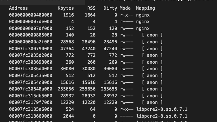 I use pmap -x [pid] I checked it twice worker Memory distribution of the process , What changes is the part framed in the second picture , Judging from the address, the whole memory has been changed , But after exporting and stringing the memory data , There is no effective information for further investigation .