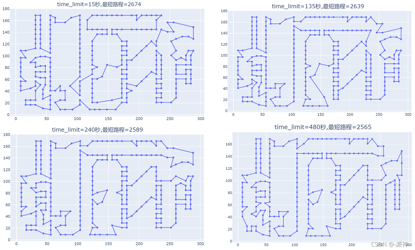 When we changed our search strategy , We found that the shortest distance from the original 2790 Turned into 2672, The access path has been further optimized , So here comes the question , Can we extend the search time to get a better access path ? Let's do an experiment , We will gradually extend the search time , And observe the shortest distance and access path :