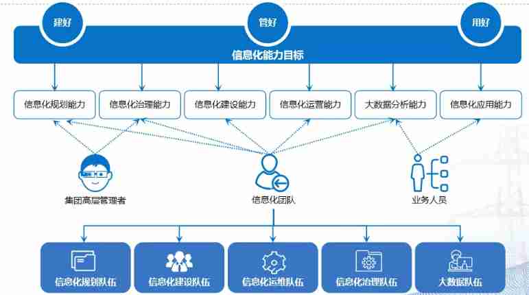 The group's informatization capability system includes planning 、 government 、 Building 、 operating 、 Big data analysis and application 6 A kind of informatization ability , planning 、 Building 、 Operation and maintenance 、 government 、 Big data analysis five informatization teams .