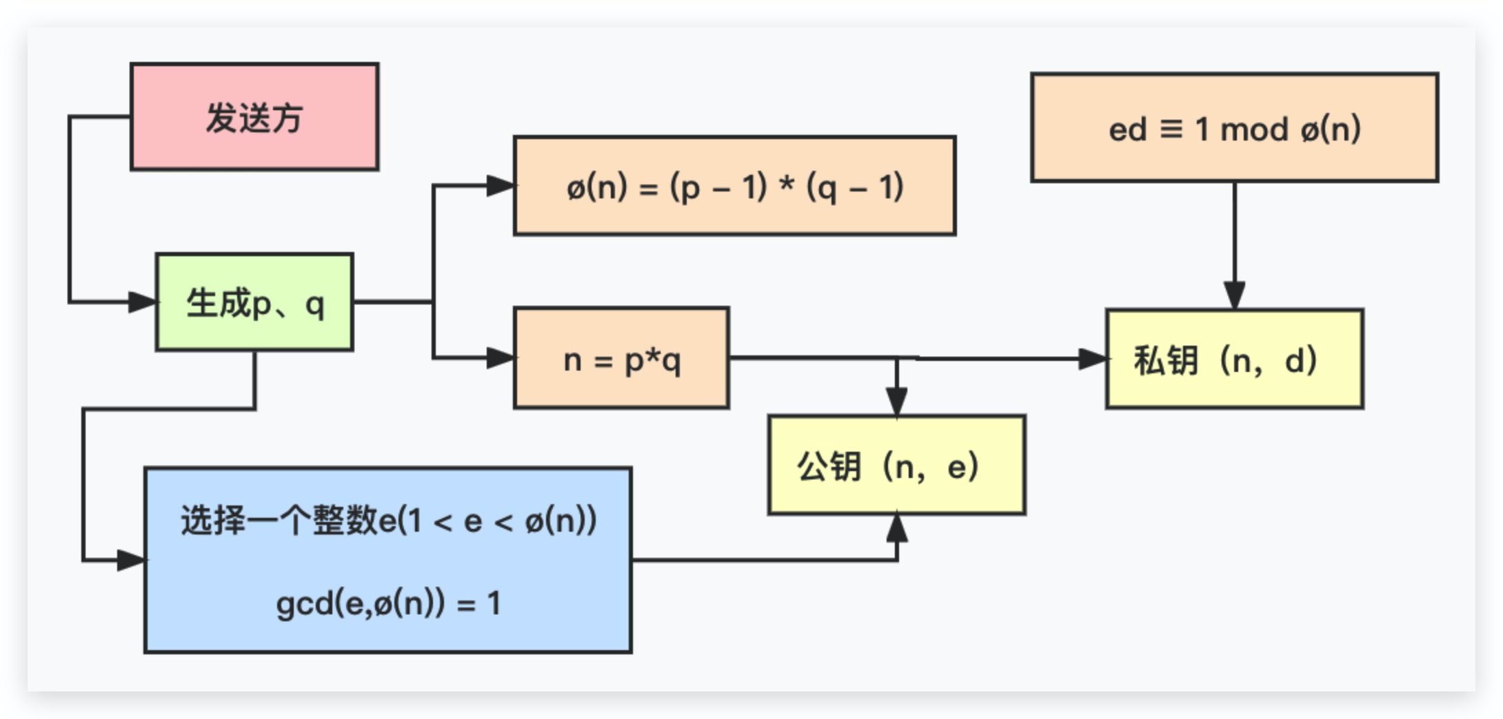 - 使用公钥加密的消息只能使用私钥解密,RSA 算法的密钥通过以下方式生成: