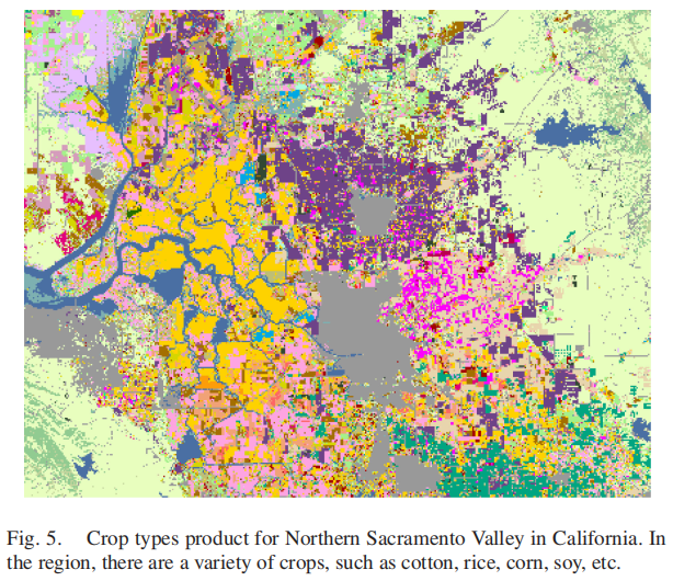 In our research , Northern Sacramento Valley, California, was selected as the study area , The region has a typical Mediterranean climate . The Mediterranean climate is 3 Month to 9 There is plenty of sunshine during the growing season , Less cloud , It is conducive to obtaining more useful remote sensing images . In the area , I chose about 100km×100km As the study area , Pictured 5 Shown . There are many crop substrates in this area , Including tomatoes 、 corn 、 rice 、 grapes 、 clover 、 Sunflower 、 Clover 、 Almonds and walnuts , And other special crops ( Like watermelon 、 Carrot 、 Onions 、 peas ) Pictured 6 Shown . The basic information of crop types in this area can be seen from CDL Obtained in the product .