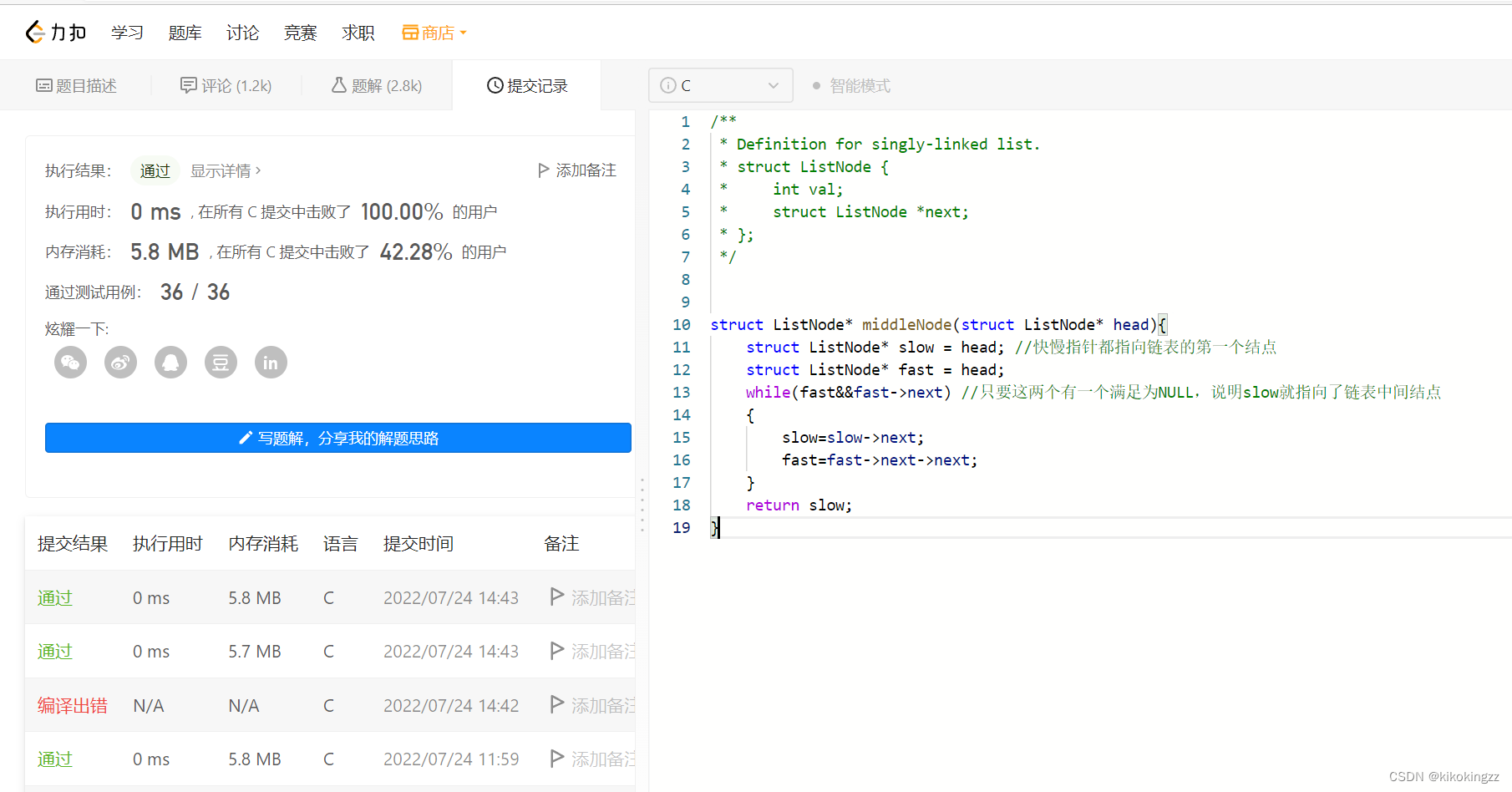 struct ListNode* middleNode(struct ListNode* head){ struct ListNode* slow=head; if(head==NULL) // If it is an empty list , that fast It didn't exist at first return NULL; struct ListNode* fast=head->next; while(fast) { fast=fast->next; // Whether it is an even number of nodes or an odd number of nodes ,fast There will be no null pointer in the penultimate step of if(fast!=NULL) // At the last step ,fast May already be empty , At this time, there is no need to take another step backwards fast=fast->next; slow=slow->next; //slow One step back at a time } return slow; }
