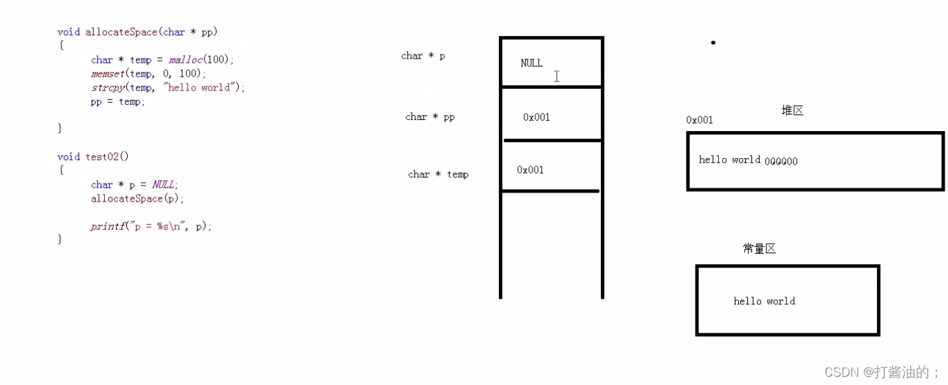void test03() allocateSpace2(&p); printf("%s\n", p); free(p); } int main(){ |