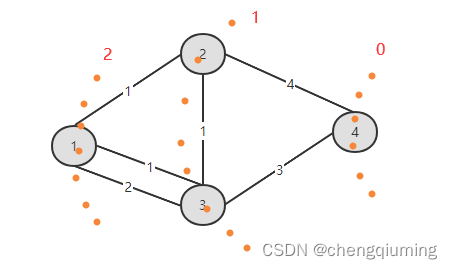 2 从节点1正向广度优先遍历,沿着高度减1的方向遍历,找边商色号小的邻接点,节点1到2的色号为1,节点1到3的色号为1,节点1到3的另外一条道路色号为2,最小色号为1,输出1,。目前无法确定选择哪条边,因此将可能走的两个邻接点2和3入队并暂存。