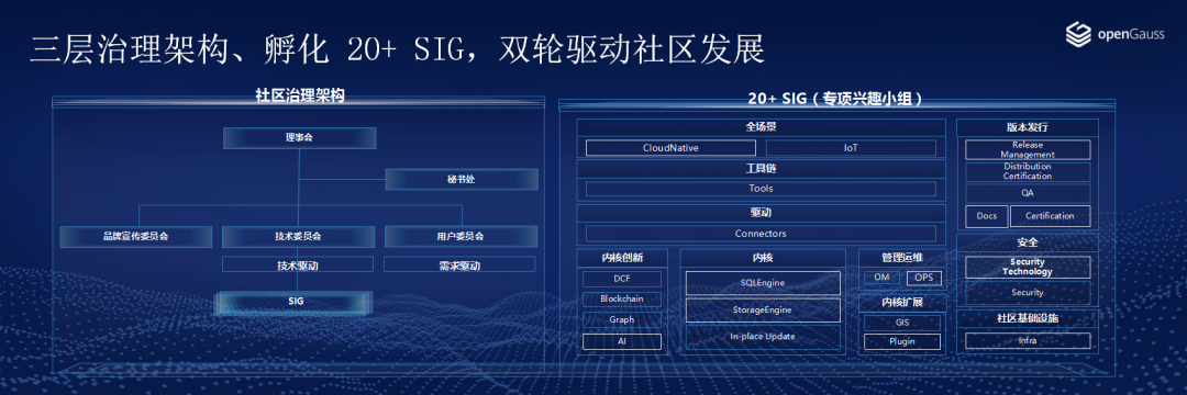 截至目前,openGauss社区在技术委员会的领导下,孵化的 SIG 已经达到 24 个,SIG组成员达到200+人。其中不仅覆盖了 SQL 引擎、存储引擎内核模块,还包括驱动、 数据安全、工具链等必备产品能力;同时社区将长期、持续地聚焦内核创新,形成了面向 AI、图、区块链等新特性 SIG 组;此外不断扩展应用场景,在云原生、IOT 等场景也布局了 SIG 组,在拓展广度的同时,同样重视技术深度的探索。