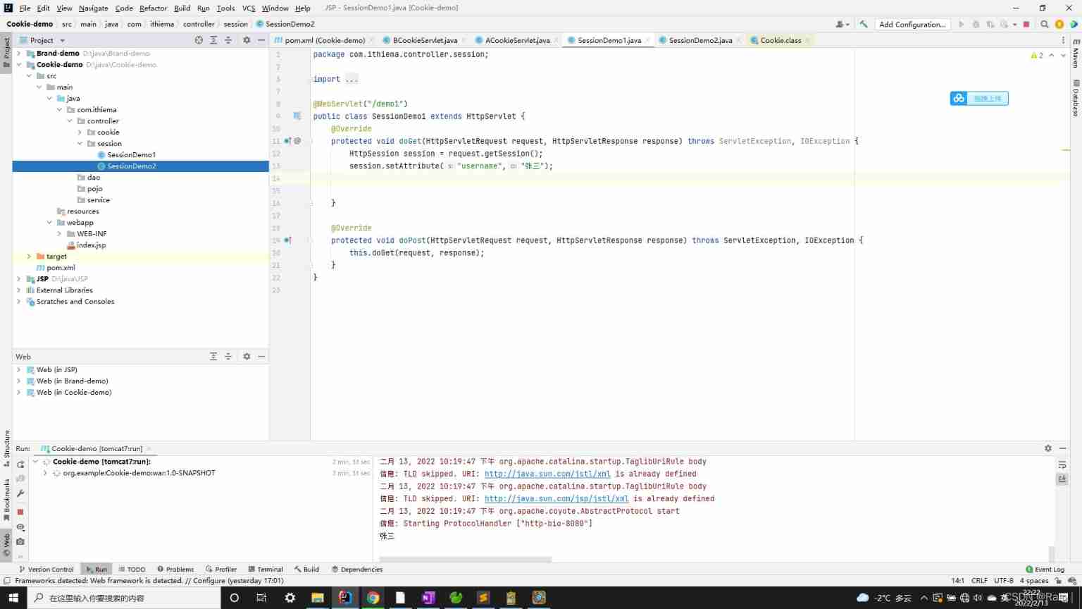 Session Is based on Cookie Realized , Exists in the program Session when ,Tomcat Will automatically detect , And create the corresponding response header set-Cookie:JSSESSIONID = ... Send it to the browser , The browser wants to access Session The request header will be issued when the domain Cookie: JSSESSIONID = …, Not like Cookie Send data directly .