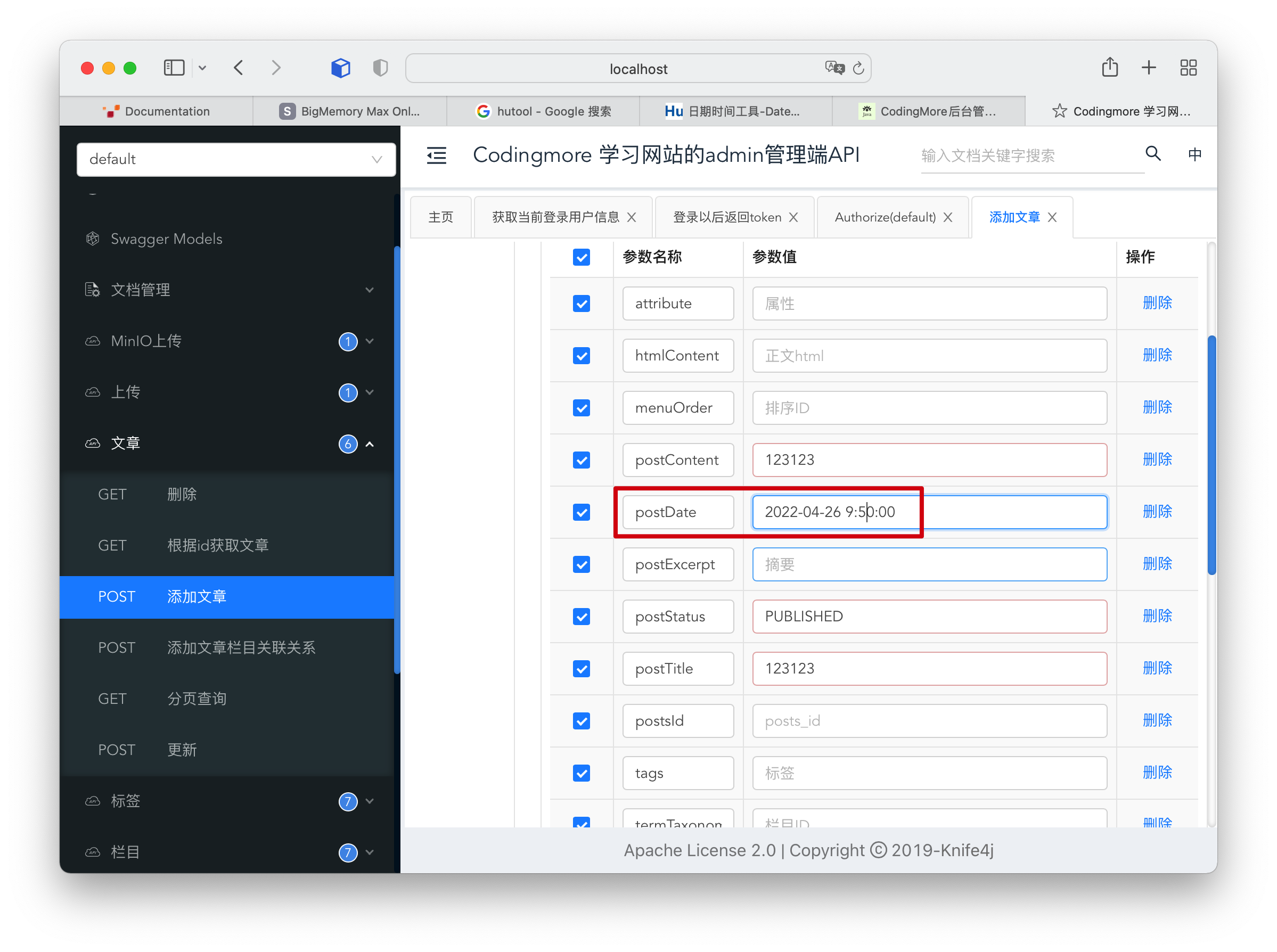 good , We now start the service , adopt Swagger Let's test it , Pay attention to setting the regular publishing time of articles .