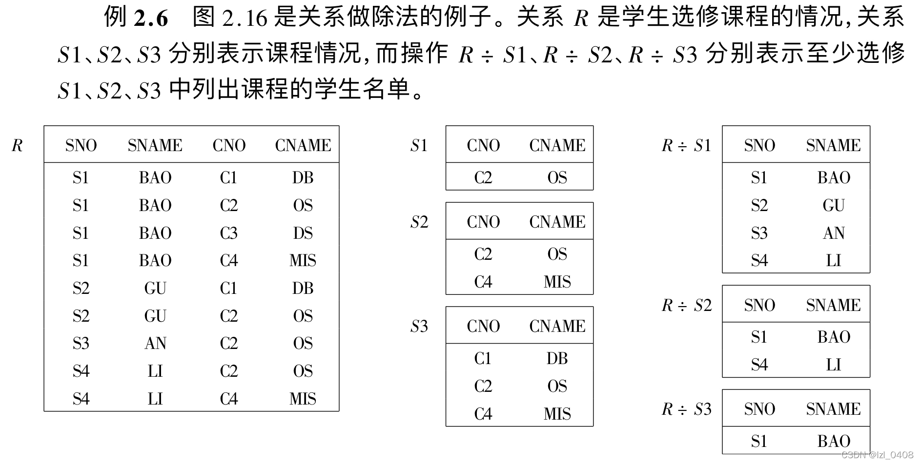 Definition : Set up a relationship R Divide by relation S The result is relationship T, be T Include all in R But not in S Properties and their values in , And T Of Tuples And S All combinations of tuples of are in R in