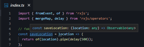 saveLocation 是一个函数,它能把任何传入的输入参数,包裹成一个 Observable,并且这个 Observable 并不是立即 emit 数据,而是延迟 500 毫秒。