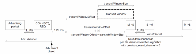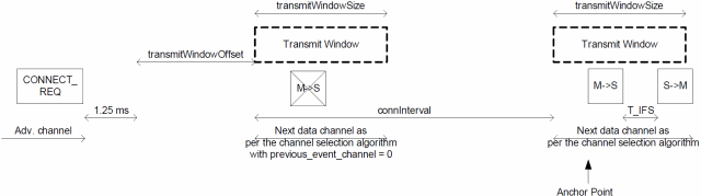 1)从Master的视角看,当它发出CONNECT_REQ后,会在1.25 ms + transmitWindowOffset到1.25ms + transmitWindowOffset + transmitWindowSize之间,发送第一个packet(M->S)。同理,Slave在收到CONNECT_REQ之后,也会在相应的时间区间去接收packet(M->S)。