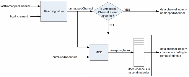 c)确定unmappedChannel的算法为:unmappedChannel = (lastUnmappedChannel + hopIncrement) mod 37,本质上就是每隔“hopIncrement”个Channel取一次,相当直白和简单。