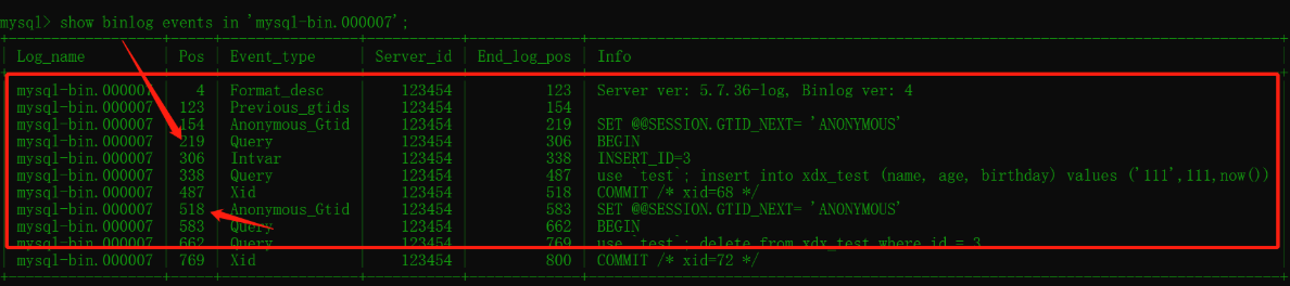 mysqlbinlog --start-position=219 --stop-position=518 --database=my_test mysql-bin.000007 | mysql -uroot -p123456 -v test执行结果信息:
