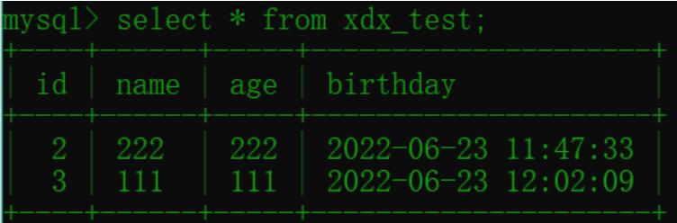 insert into xdx_test (name, age, birthday) values ('222',222,now());查询数据:
