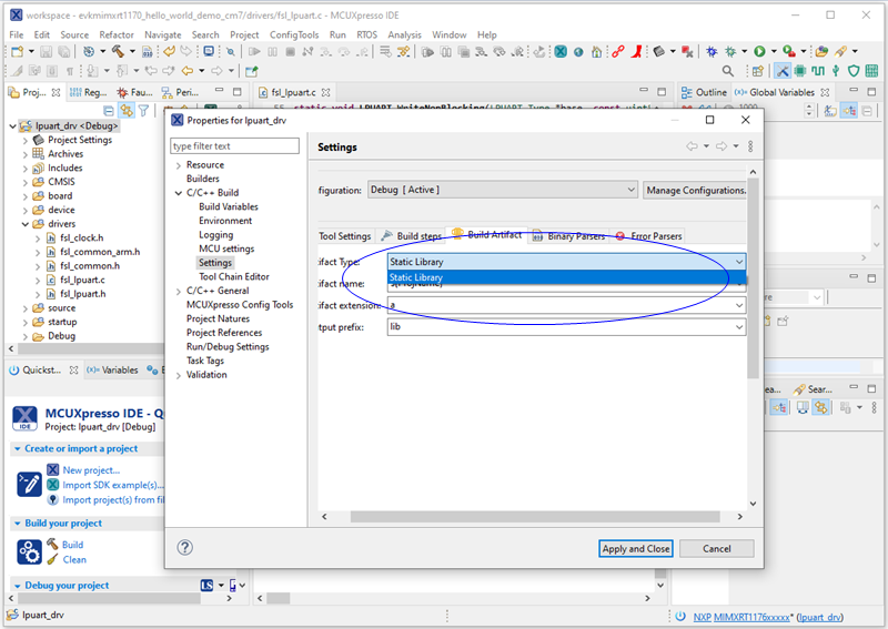 新建了 C Static Library 工程后发现工程里还是残留了多余的 .c 文件(Debug Console 和 device 初始化相关文件),这时候再手动移除这些 .c 文件,然后打开工程选项 C/C++ Build / Settings / Build Artifact / Artifact Type,此时仅有 Static Library 一种选择。编译工程可得到 liblpuart_drv.a 文件(MCUXpresso IDE 特意在用户设置的库名加了 lib 前缀,这是刻意设计的,后面使用该库文件时会用到这个设计),即是我们需要的静态 Lib 库文件。