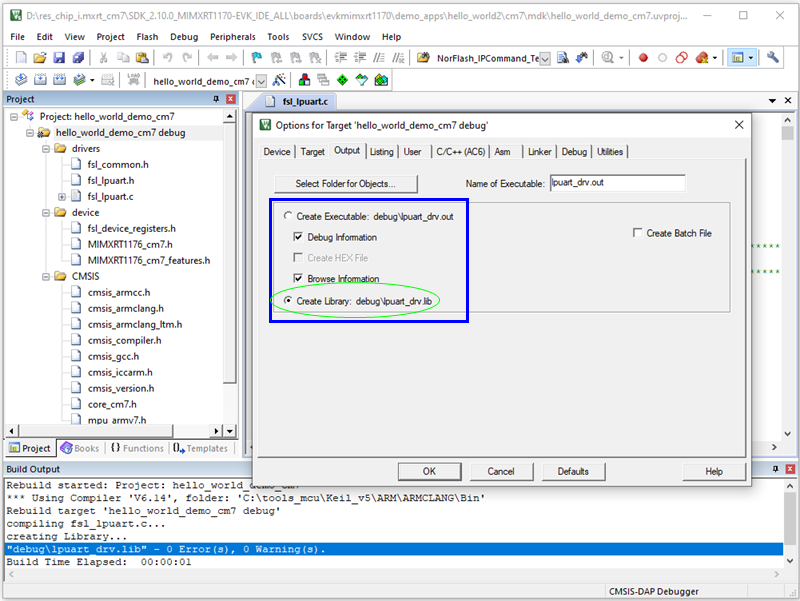 3. 在工程选项 Output / Name of Executable 里命名生成的库文件(比如 lpuart_drv.lib )。