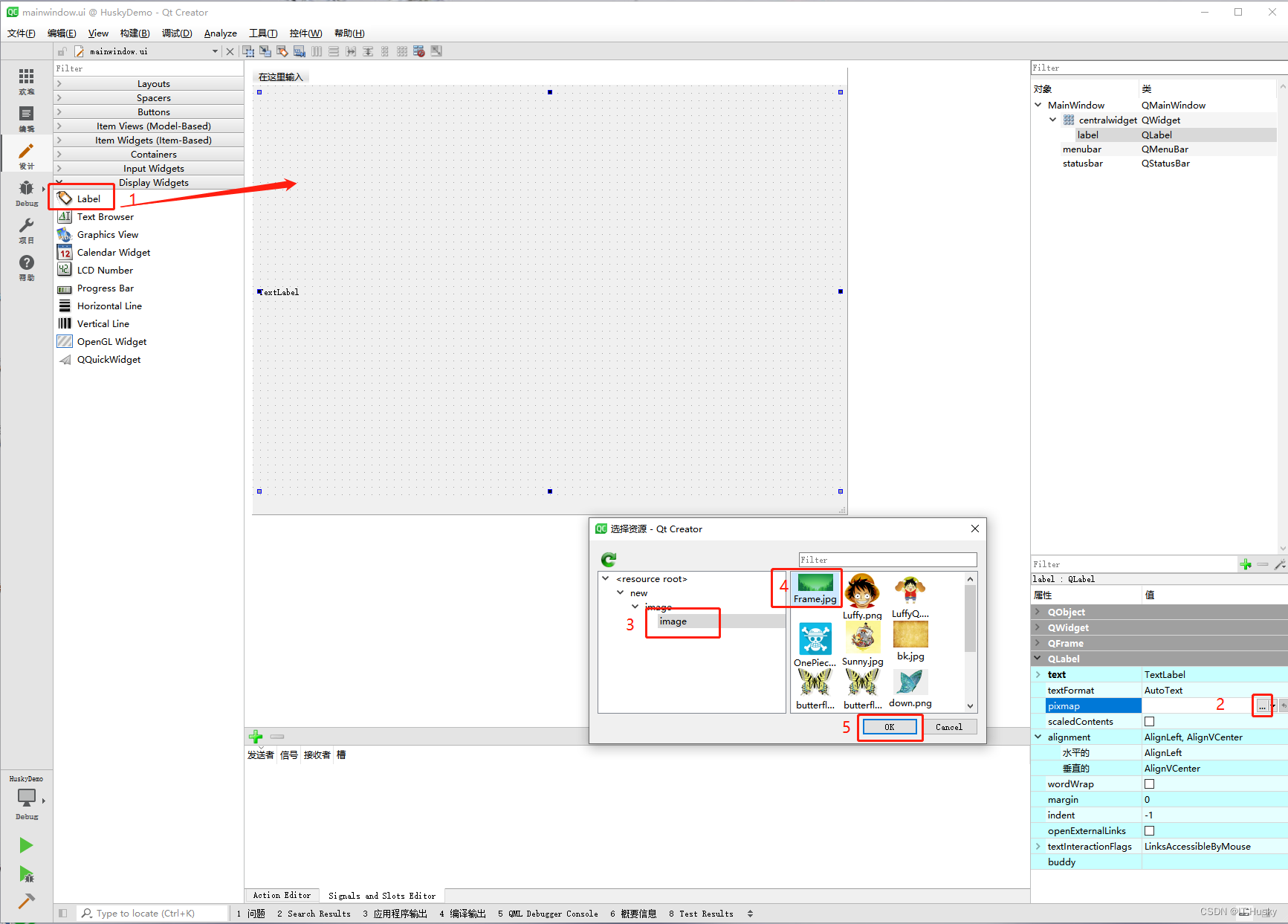 8、 Drag a in the main window Label, stay label In the property bar of pixmap, Click on “...”, Select resource file .