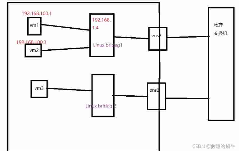 vm1 and vm2 Connect Linux bridge1, The two can communicate with each other and through ens2 Visit the Internet