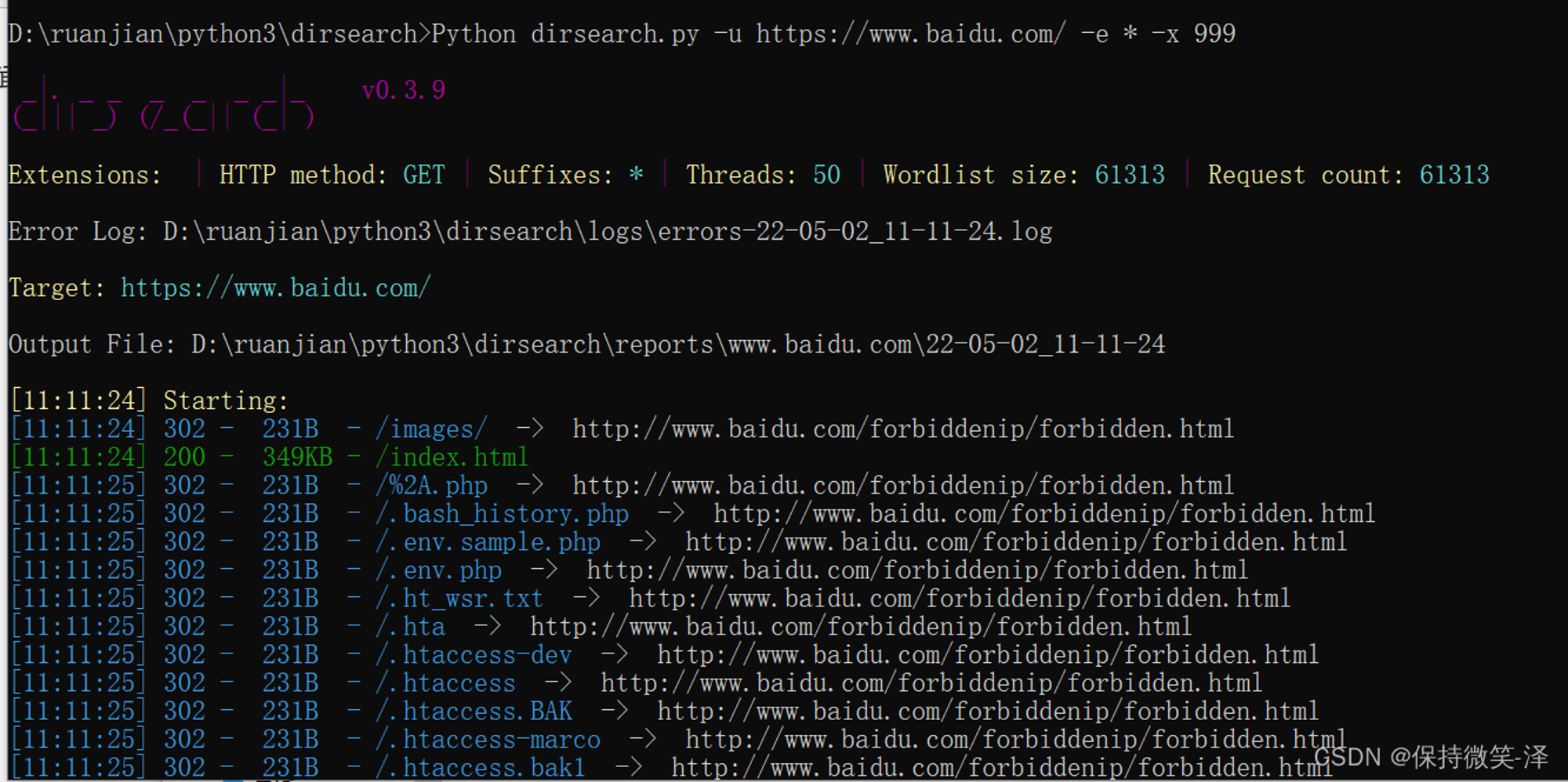 Python dirsearch.py -u https://www.baidu.com/ -e * -x 999