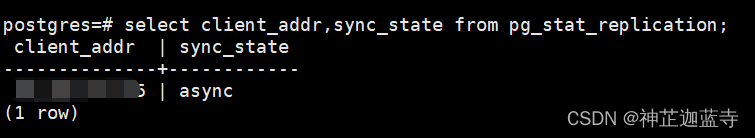 select client_addr,sync_state from pg_stat_replication;Return the following values to indicate success , You can also create tables in the main database , Insert , Check whether the slave library is synchronized by operations such as emptying