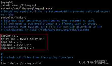 Yes slave To configure , Turn on the relay log , Assign a unique servr ID, Set read-only permissions . Add the following values to the configuration file :