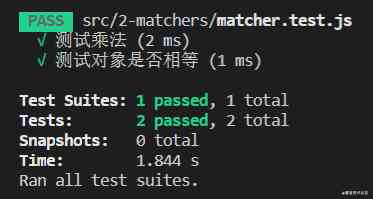 运行yarn test,可看到控制台显示两个测试通过;如不通过控制台也会提示哪个测试用例出错。