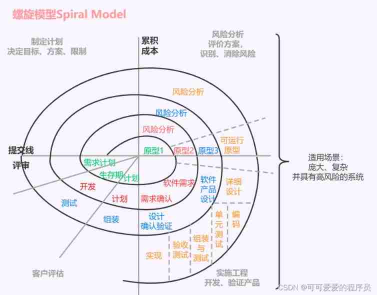 - advantage : Risk analysis is emphasized , Help integrate software quality into development ; Build large software in small segments , Easy to calculate cost ; Customer involvement , Ensure project controllability .