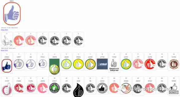 Size of image index database : Millions of trademarks . The first picture here is a query , The next line is the related list returned , The rest of the lines are given by the search engine in descending order of relevance .