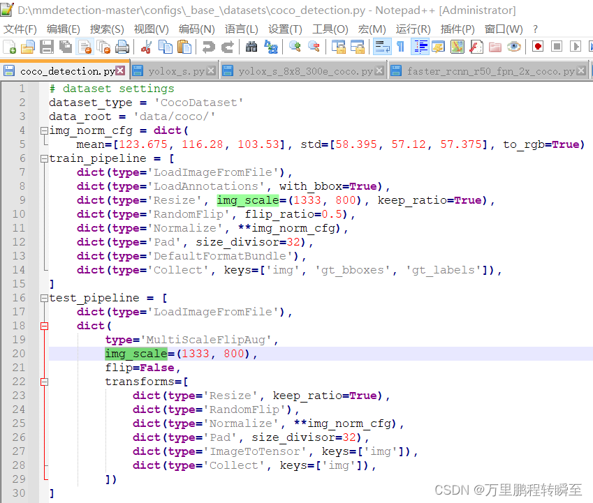 faster-rcnn的模型配置文件中不存在图像size的设置参数,是通过设置configs\_base_\datasets\coco_detection.py中的size来控制输入图像的size,具体可见图5
