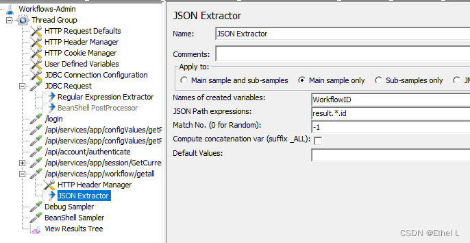 4, Interface returns data , use json The post processor extracts the data returned by the interface , Coexist with variables WorkflowID in