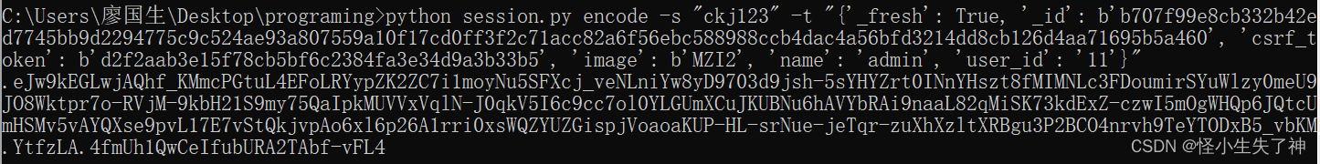 python session.py encode -s "ckj123" -t "{'_fresh': True, '_id': b'b707f99e8cb332b42ed7745bb9d2294775c9c524ae93a807559a10f17cd0ff3f2c71acc82a6f56ebc588988ccb4dac4a56bfd3214dd8cb126d4aa71695b5a460', 'csrf_token': b'd2f2aab3e15f78cb5bf6c2384fa3e34d9a3b33b5', 'image': b'MZI2', 'name': 'admin', 'user_id': '11'}"