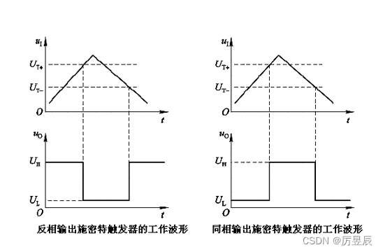 As shown in the figure , When inputting triangular wave , According to the voltage transmission characteristics of Schmidt trigger , The output waveform of the corresponding Schmidt trigger can be obtained .