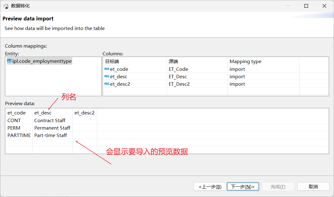 4. Data import preview , Here, you need to pay attention to whether the data corresponds to the column name , meanwhile CSV The first line is the column name , No import