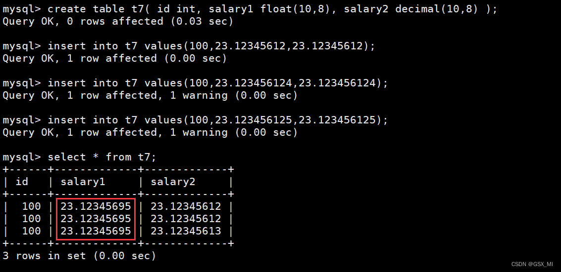 float[(m, d)] [unsigned] : M指定显示长度,d指定小数位数,占用空间4个字节①案例