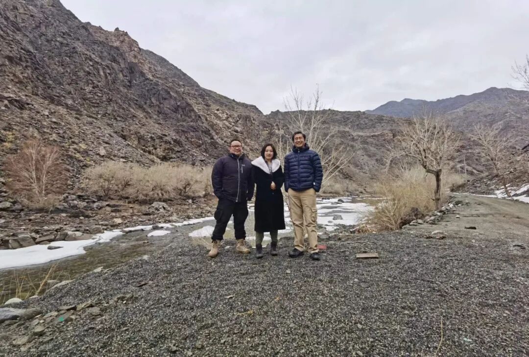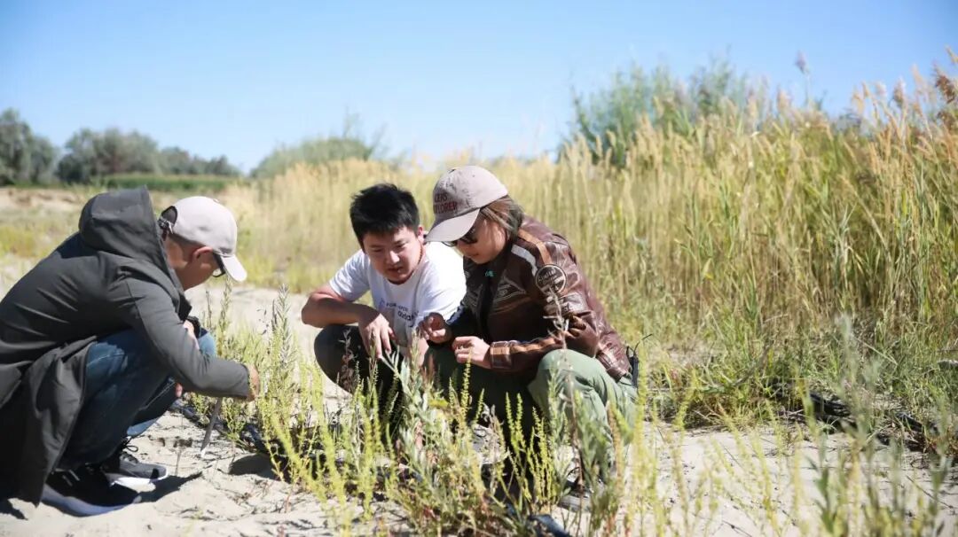图注:初雯雯与协会成员在乌伦古河流域附近视察獾木柳的生长情况