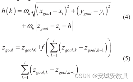 Is the spatial position of the target at the current time ,(), i i ix y z It is the space position of the UAV at the current time ,h It is the height between the UAV and the target to be maintained ,, The goal is kz In the coordinate system for the target k The altitude value of the moment ,,0goalz Is the height value of the target at the initial time in the coordinate system ,σ Is the standard deviation of sensor noise .Aω、bω Represent the weight of plane distance cost and vertical height cost respectively . By changing their size , It can be determined whether the UAV will choose to fly upwards or horizontally when encountering obstacles in front .