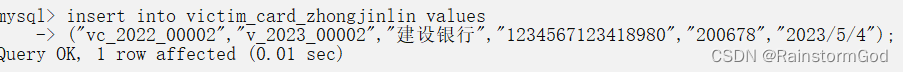 -> ("vc_2022_00003","v_2023_00003"," Agricultural bank of ","1234667123418980 ","500987","2023/5/5");
