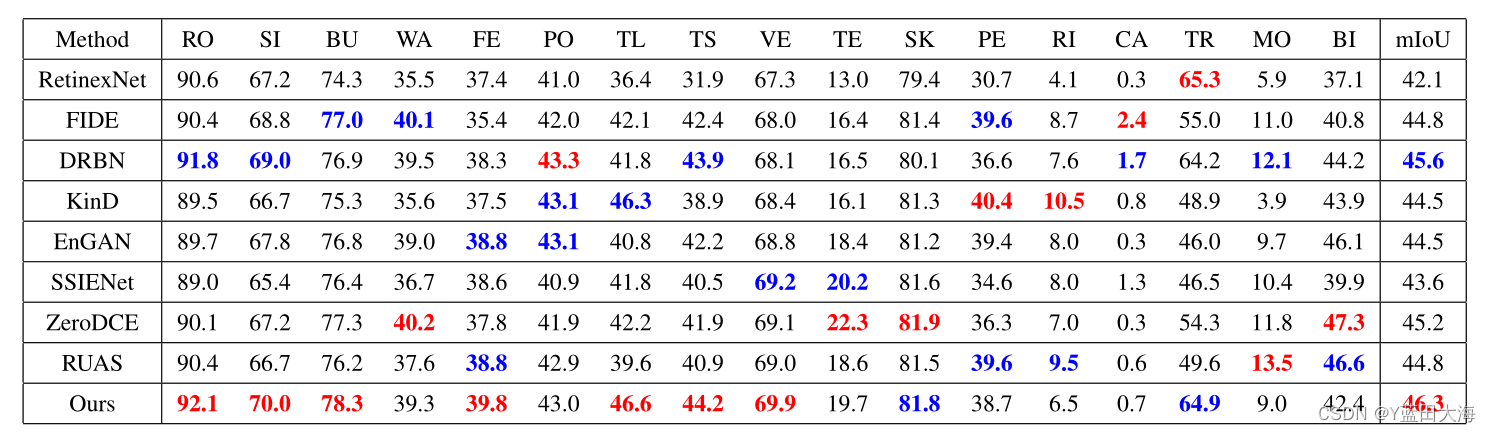 surface 5.ACDC Quantitative results of nocturnal semantic segmentation on data sets . A set of symbols {RO,SI,BU,WA,FE,PO,TL,TS、VE、TE、SK、PE、RI、CA、TR、MO、BI} Express { road 、 Sidewalk 、 building 、 The wall 、 fence 、 Pole 、 traffic lights 、 traffic sign 、 Vegetation 、 terrain 、 sky 、 people 、 Rider 、 automobile 、 train 、 The motorcycle 、 Bicycle }. Be careful , We retrained the segmentation model according to the enhancement results generated by all comparison methods . The best result is red , The second is blue .