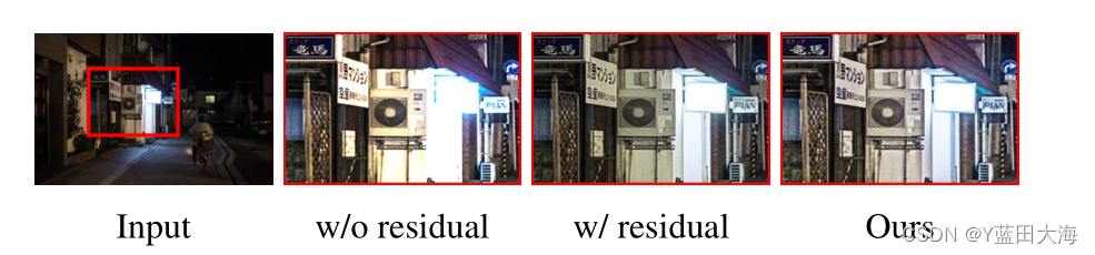Melting research . We compared the graph 13 Performance of different modes in . Direct learning illumination will lead to overexposure of the image . The process of learning the residual between illumination and input does suppress overexposure , But the overall image quality is still not high , Especially the grasp of details . By comparison , The enhancement result using our method not only suppresses overexposure , And enrich the image structure .