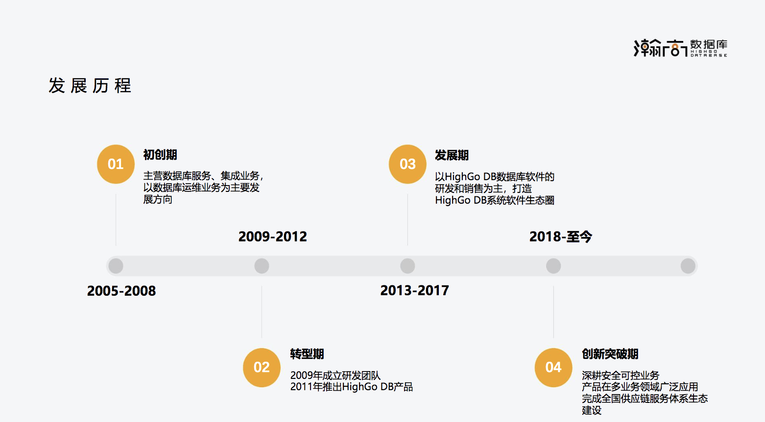 With the continuous advancement of localization process , We see that there is no core product in the professional field of database , Development is actually subject to great limitations . So the company stay 2009 Transformation started in , From the traditional operation and maintenance service to the research and development of an independent and controllable domestic database product , And in 2011 Launched its own database products in HighGo Database. After entering the development period , We do constant iterations on product functions , Strive to build an ecosystem of products .