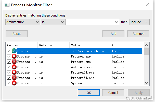 先启动Process Monitor工具,将要监测的进程设置为TestScrrenCatch.exe: