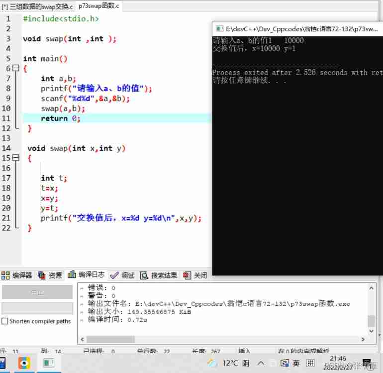 According to the definition of exchange function , All values should change , But the result is not so , In contrast, I have another program , I put the print function (printf) Put it in swap Function , Values change
