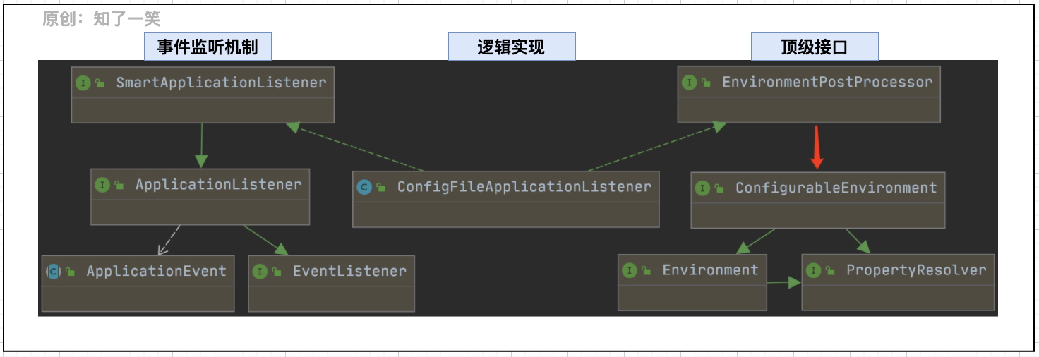 从源码的结构图来看,配置文件的加载逻辑也是采用事件模型实现的,这在前面任务管理中有详细的描述;配置的核心作用就是在程序启动时进行加载引导,这里关键要理解EnvironmentPostProcessor的接口设计;