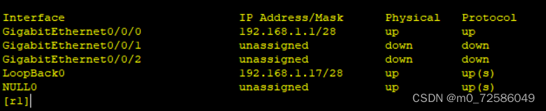 [r1-GigabitEthernet0/0/0]ip address 192.168.1.1 28