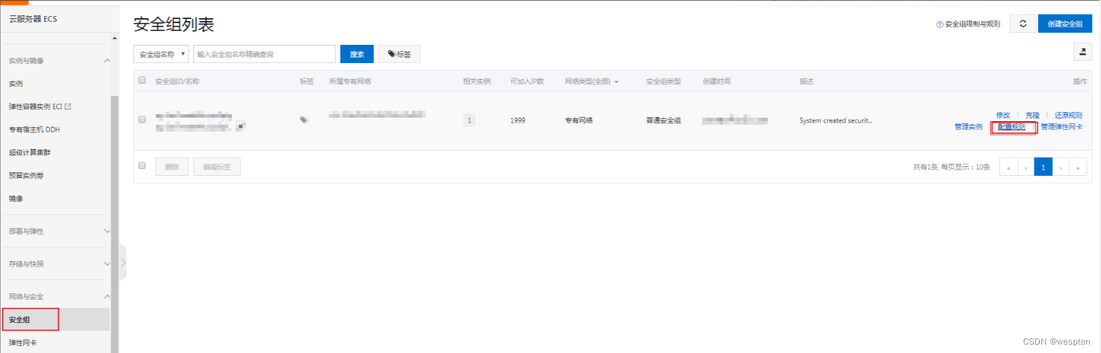 Alibaba cloud security group settings , Log in to alicloud , Access control ->ECS The server -> Network and security -> Security group , Click more in the instance list , Click Configure rules .