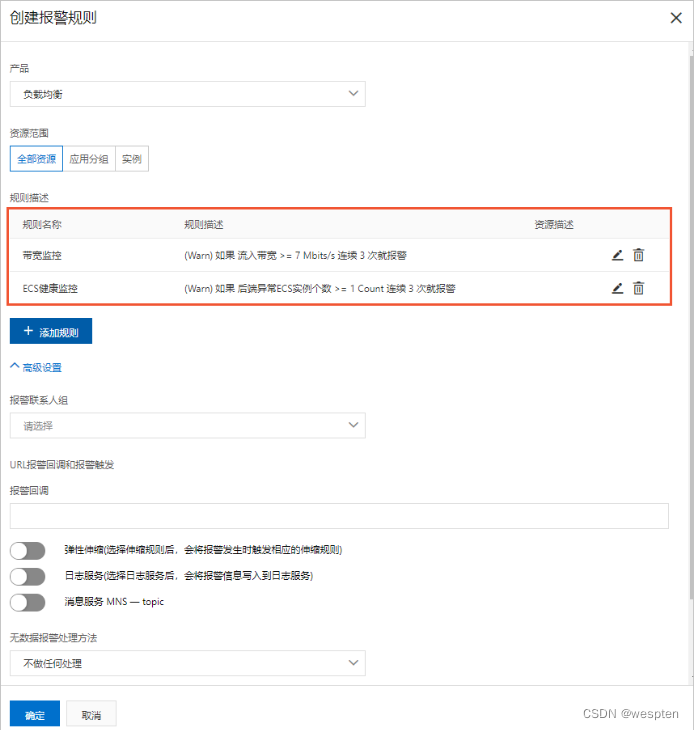 In order to better use the load balanced cloud monitoring service , You need to start the health check of load balancing first , And set the alarm rules according to the actual situation , For example, set the alarm threshold of the load balancing bandwidth value to 7 Mbit/s.