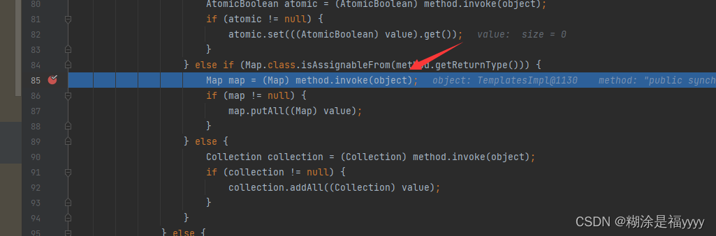 We go back to 71 That's ok , Know us _bytecodes It is here that the value is assigned to value, Next to the 83 Set the line value to TemplatesImpl The corresponding variables in the class . We enter setValue Inside . Will first judge whether the method can be obtained , If not , Execute to 131 Set the value of the line to the property .