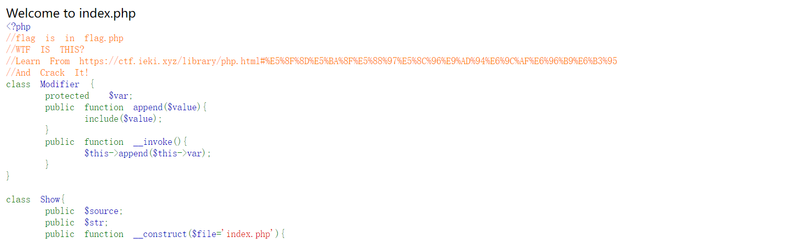 2、我们的最终目标是获取flag.php中的flag信息,因此分析源代码信息,查看哪里可以获取到flag.php文件,发现在Modifier类中存在include($value),因此想到可以通过php伪协议来获取flag.php的信息,所以现在我们的目的就成了调用append函数,接着往下观察,发现__invoke函数调用了append函数,因此我们只要执行了__invoke函数一样可以获得flag信息,那该怎么执行__invoke函数呢:
